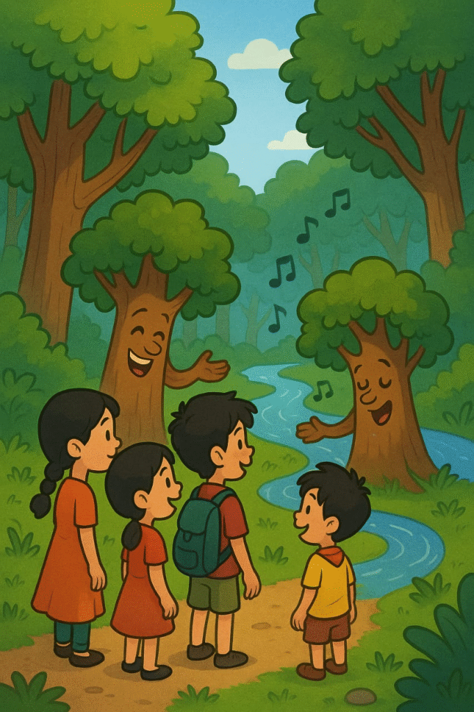 पेड़ बच्चों को संदेश दे रहे थे। चलते-चलते वे एक सुंदर नदी के किनारे पहुंचे। नदी का पानी चमचमा रहा था और मधुर स्वर में गा रही थी: