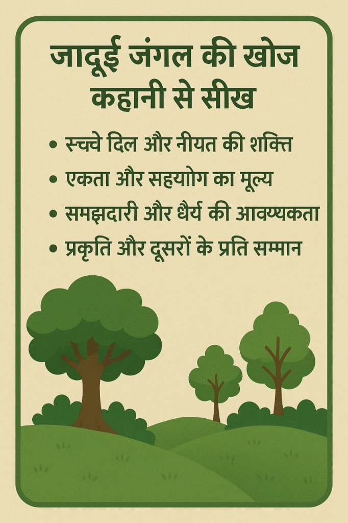 इस तरह, "जादुई जंगल की खोज" एक सुंदर संदेश देती है कि सच्चाई, एकता, समझदारी और प्रेम से जीवन में हर कठिनाई को पार किया जा सकता है।