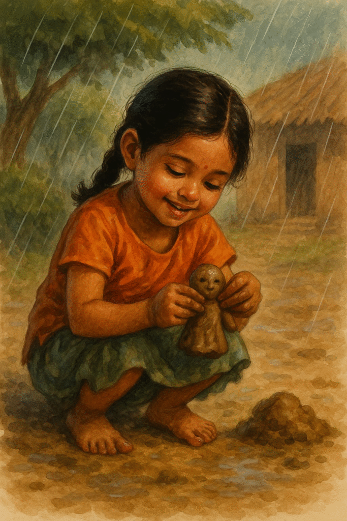 गुड़िया ने दिन भर उस मिट्टी से एक छोटी सी गुड़िया बनाई। दो आँखें, छोटी-सी नाक, और मुस्कराहट वाली होंठ — जैसे-जैसे वो बनती गई, गुड़िया उसमें अपना प्यार उड़ेलती गई।