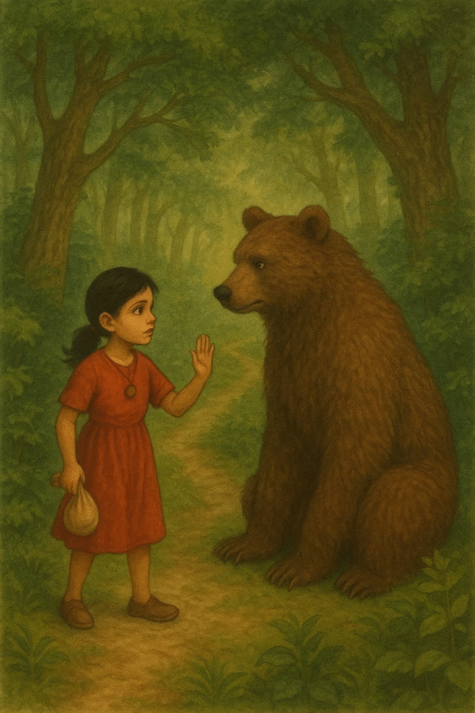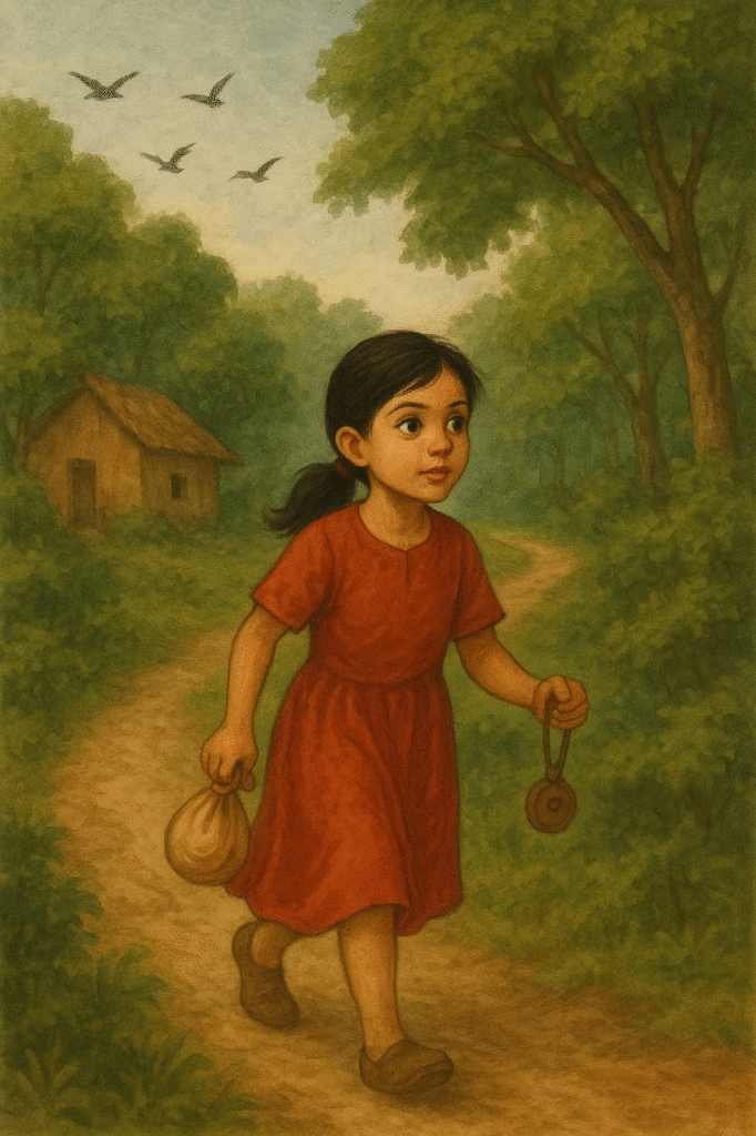 अगली सुबह, नीलू एक छोटी सी पोटली में रोटी, पानी और अपनी दादी की दी हुई लकड़ी की मूर्ति लेकर निकल पड़ी। रास्ता लंबा और मुश्किल था — कांटों से भरी झाड़ियाँ, गहरी नदियाँ और ऊँचे पहाड़।