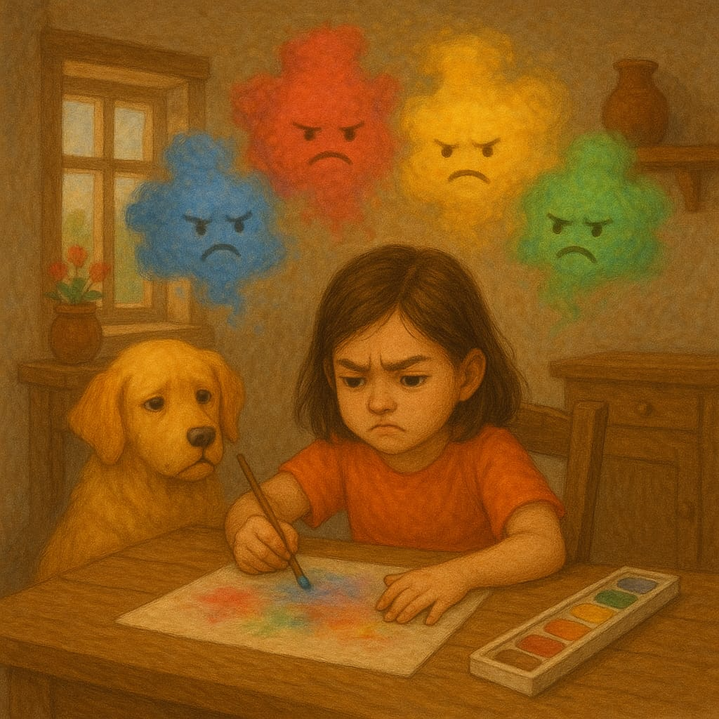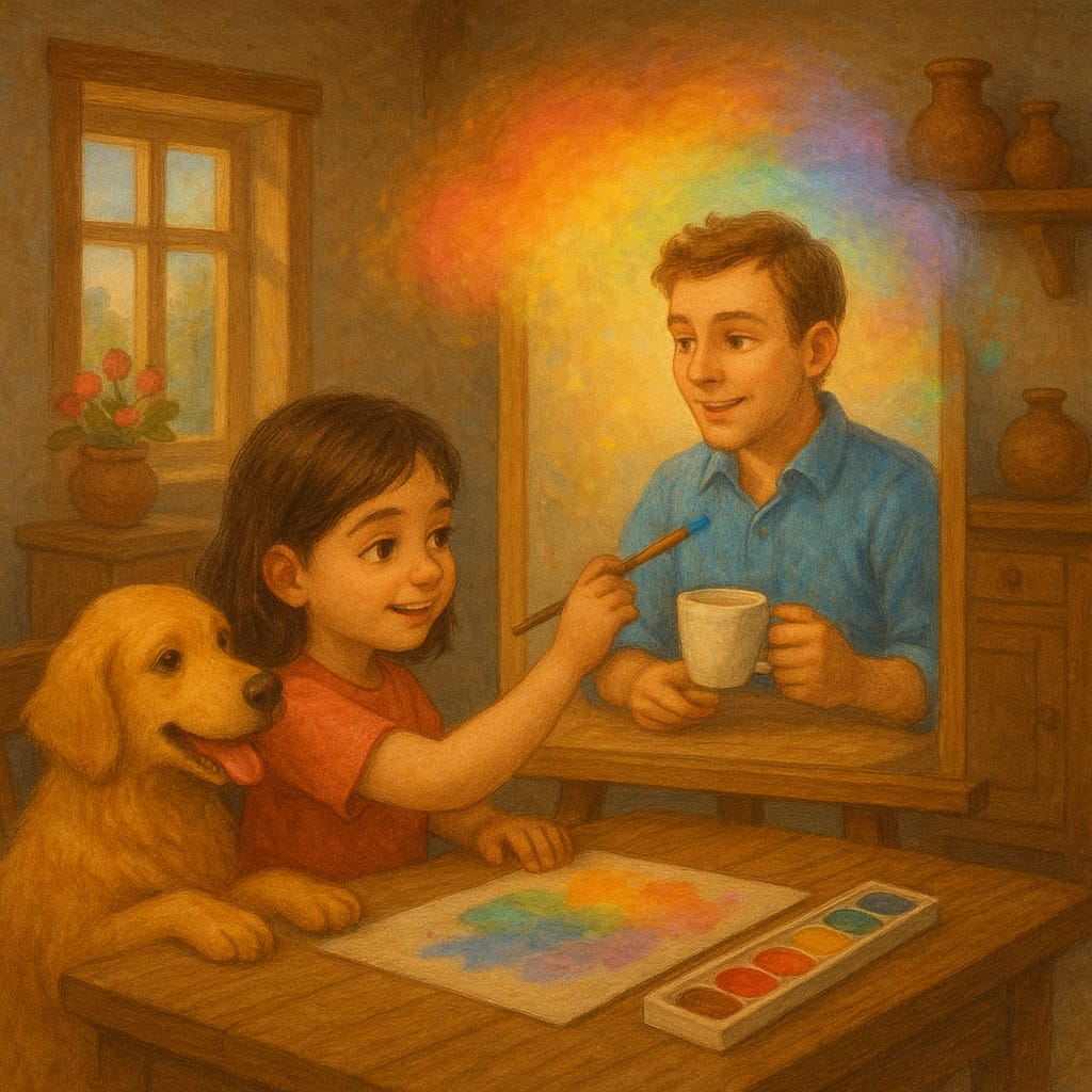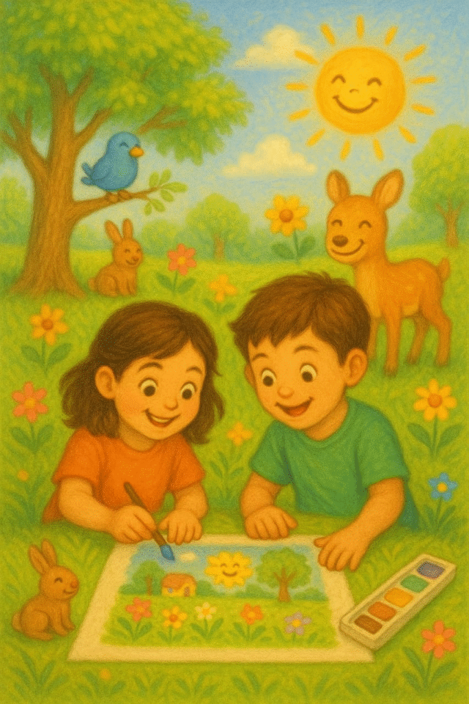 दोनों ने मिलकर एक बड़ा चित्र बनाया—जिसमें स्कूल, पेड़, बच्चे और जानवर थे। रंगों ने फिर से बोलना शुरू किया। अब पूरे गाँव के बच्चे रोज़ मिलकर बड़े-बड़े चित्र बनाते और उनसे बात करते।