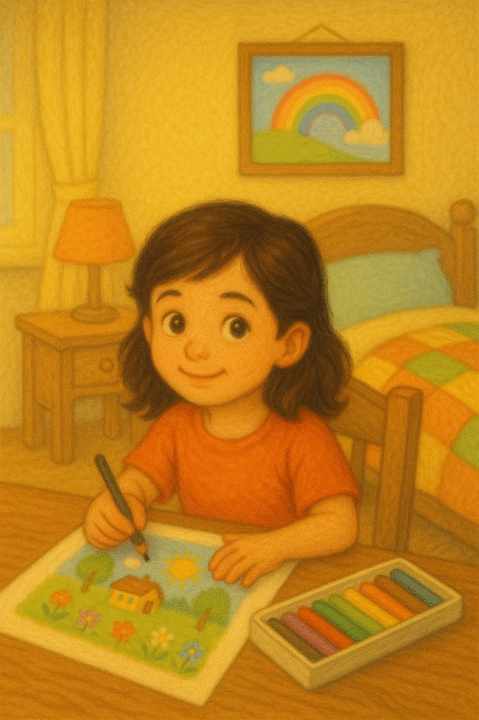 नीलू ने एक चित्र बनाना शुरू किया—एक पेड़, एक पक्षी और एक सूरज। जैसे ही उसने नीला रंग पक्षी पर लगाया, पक्षी बोल पड़ा, “धन्यवाद नीलू! अब मैं उड़ सकता हूँ।”