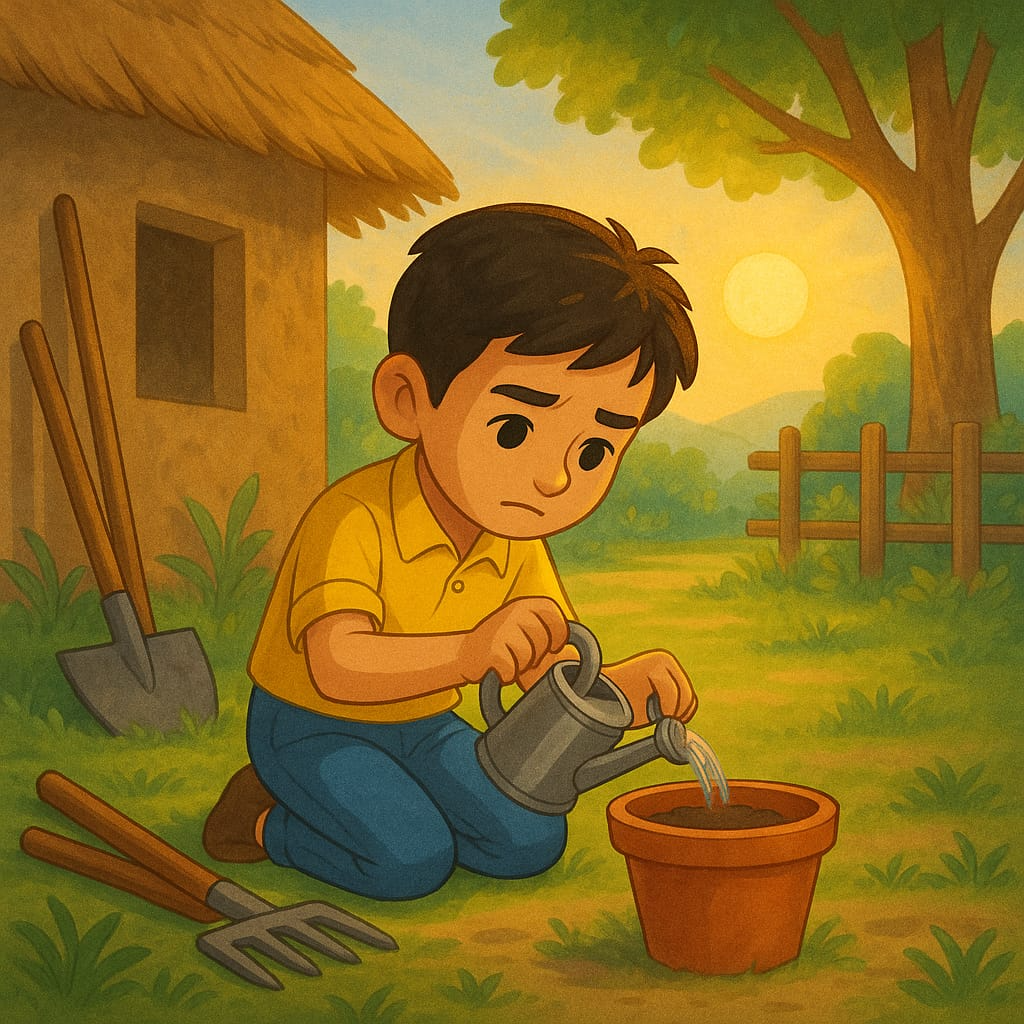 अर्जुन परेशान हो गया। लेकिन उसने हार नहीं मानी। उसने बीज को दूसरी मिट्टी में लगाया, फिर भी कुछ नहीं हुआ। उसके दोस्तों के पौधे बड़े हो रहे थे – किसी का गुलाब, किसी का तुलसी, किसी का आम का पौधा। लेकिन अर्जुन के गमले में बस मिट्टी थी — सूनी और खाली।