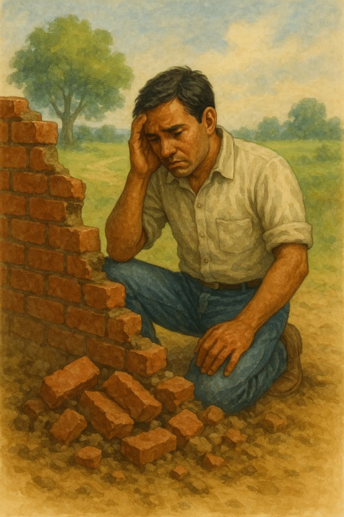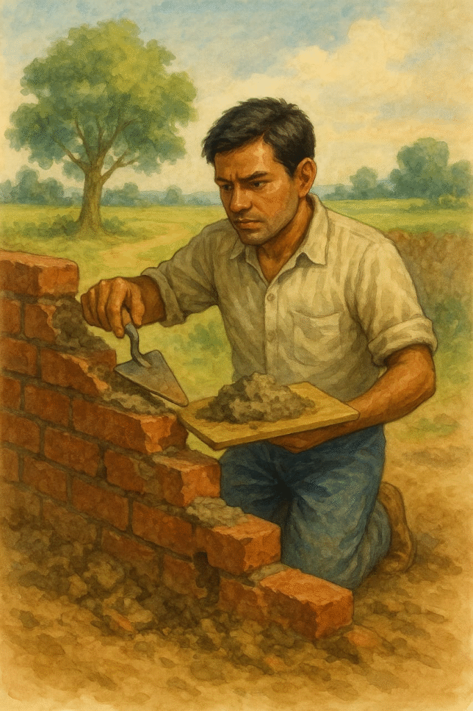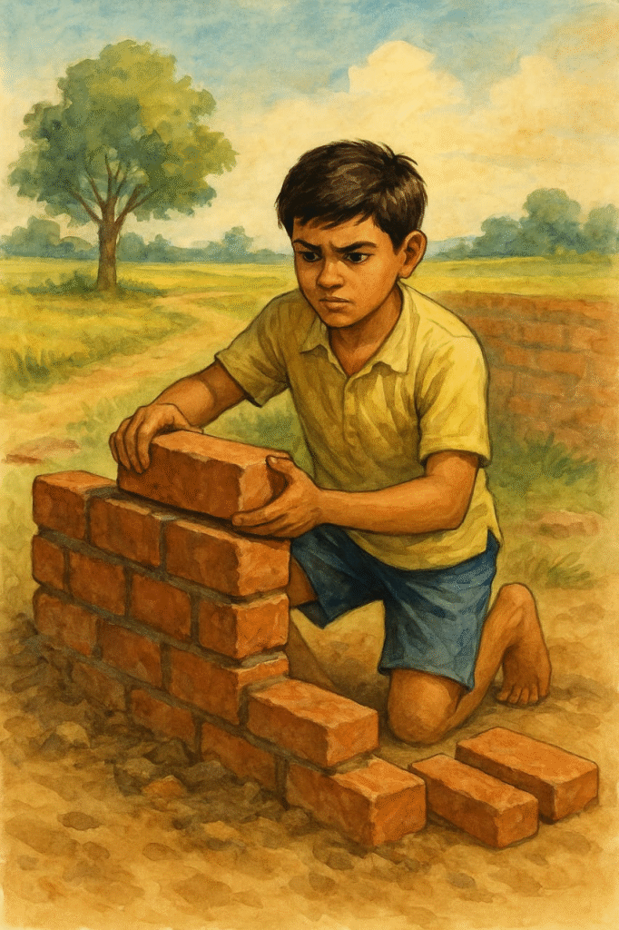 वह गाँव के निर्माण स्थल से फेंकी गई टूटी ईंटें बटोरने लगा। धीरे-धीरे, ईंट दर ईंट, अकेले अपने हाथों से वह दीवार बनाता गया।