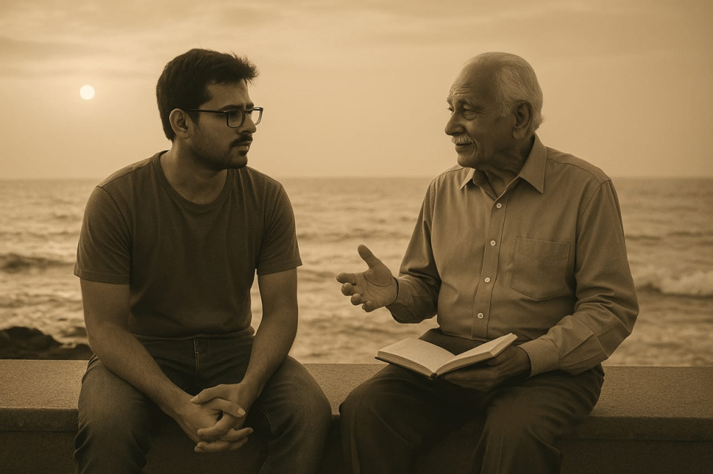उसने पीछे देखा। एक बुज़ुर्ग इंसान मुस्कुरा रहे थे। उनका नाम था राघव बाबू। उनके बाल सफ़ेद थे, आंखों में सुकून था और हाथों में एक डायरी।